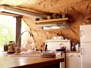 The bedroom sits deeper in the rock, where silence becomes a sound of its own. The walls curve inward like a cupped hand, wrapping the bed in a kind of geological hush.