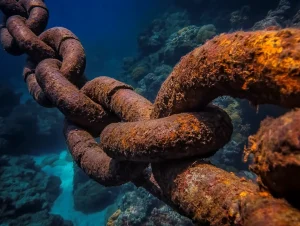 He peered overboard. The chain ran down and away, disappearing into the shimmer where shapes hinted—a curve of metal, a disc, carvings that looked more like veins than craft. It wasn’t wreckage; it was waiting.